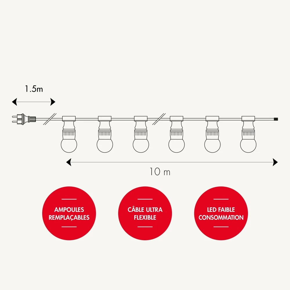 données techniques et dimensions : ce pack comprend une guirlande guinguette de 10 mètres et 10 ampoules blanc chaud. Les ampoules sont interchangeables et remplaçables. Ampoule led h:65 x ∅ 45 mm. Un mètre entre chaque ampoule.