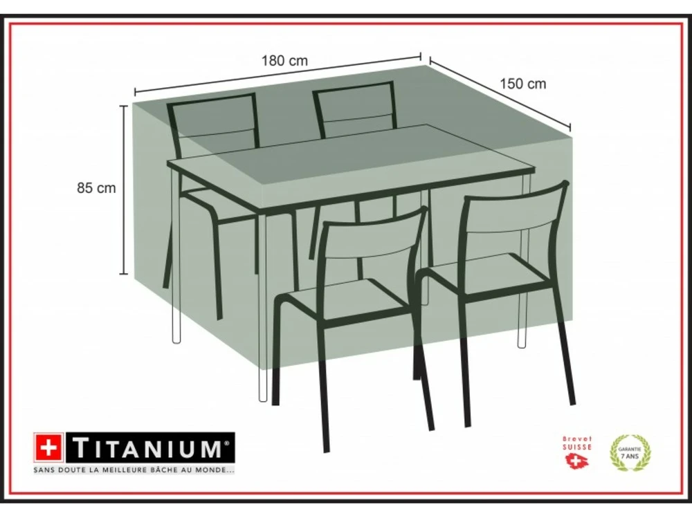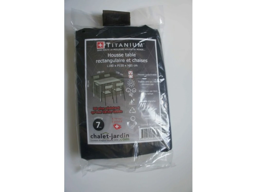 Techniquesdimensions ext. Hors tout (l x p x h) : 180 x 150 x 85 cmgrammage : 90 g/m ²matiã¨re : polyã©thylã¨necoloris : noir rayã© blancinclus : cordon de serrage ultra rã©sistantssouple et lã©gã¨re / 100 % recyclable / 100 % ã©tanche ĂŁÂ l’eau, ĂŁÂ la poussiã¨re et aux uv / rã©siste aux changements de tempã©ratures et ĂŁÂ de nombreux produits chimiquescolis dimensions : 40 x 30 x 40 cm poids : 0,820 kgcette housse de protection pour votre table rectangulaire et vos chaises vous permettra de protã©ger votre mobilier en le gardant au sec et ĂŁÂ l’abri des intempã©ries. Cette housse de protection bã©nã©ficie d’un procã©dã© ultrasonique pour une meilleure rã©sistance, systã¨me brevetã© (suisse).avantages : ultra rã©sistant, technologique, opaque, traitã© pour une protection uv, pratique, ne nã©cessite aucun entretien