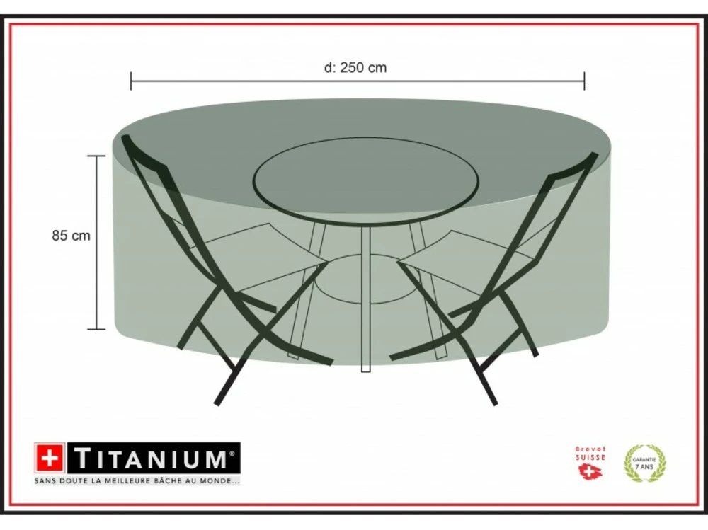 Techniquesdimensions ext. Hors tout (l x p x h) : 250 x 250 x 85 cmgrammage : 90 g/m ²matiã¨re : polyã©thylã¨necoloris : noir rayã© blancinclus : cordon de serrage ultra rã©sistantssouple et lã©gã¨re / 100 % recyclable / 100 % ã©tanche ã l’eau, ã la poussiã¨re et aux uv / rã©siste aux changements de tempã©ratures et ã de nombreux produits chimiques colis : dimensions colis : 40 x 30 x 40 cm poids unitaire : 1,280 kgcette housse de protection pour votre table rondes et vos chaises vous permettra de protã©ger votre mobilier en le gardant au sec et ã l’abri des intempã©ries. Cette housse de protection bã©nã©ficie d’un procã©dã© ultrasonique pour une meilleure rã©sistance, systã¨me brevetã© (suisse).avantages : ultra rã©sistant, technologique, opaque, traitã© pour une protection uv, pratique, ne nã©cessite aucun entretien