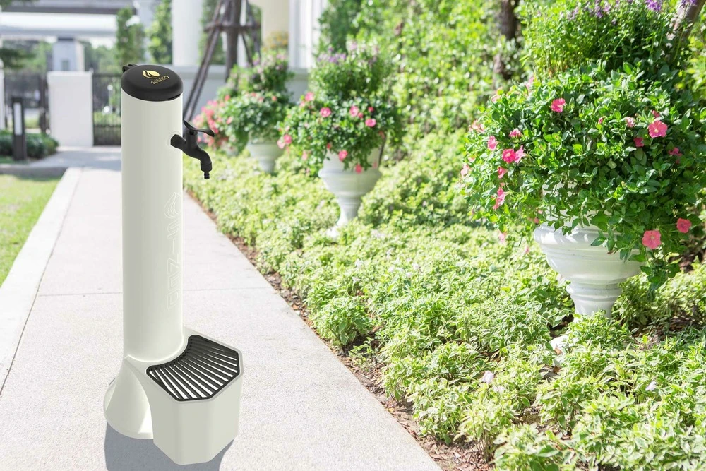 Fontaine d’extérieur en blanc avec un seau d’une capacité de 5 litres et un attrape-feuilles en fonte. Prédisposition aux raccords rapides pour tuyau d’arrosage. Recommandé pour toutes les activités de plein air, tant publiques que privées, grâce à sa construction de qualité et ses accessoires exclusifs. Raccordement d’eau latéral ou inférieur avec vanne à 3 voies, il est réalisé en hdpe (polyéthylène haute résistance) résistant aux rayons uv, au calcaire et à la salinité, parfait également pour les environnements marins. Tuyau intérieur de haute qualité qui résiste à une pression allant jusqu’à 15 bars, longueur 80 cm, diamètre intérieur 6 mm et diamètre extérieur 14 mm. Hauteur 100 cm, diamètre 15 cm. La fontaine peut également être combinée avec des seaux de différentes couleurs, noir, rouge, gris tourterelle ou vert. Principales caractéristiques – idéal pour les activités de plein air, les jardins, les condominiums, les piscines, les plages, les zones pour chiens. – hauteur 100 cm – diamètre 15 cm – robinet en alliage métallique noir mat – prêt pour les raccords rapides de tuyaux de jardin – couvercle ouvrant en aluminium – chevilles de fixation incluses – tuyaux internes tressés et métalliques de 15 kg – double disposition pour le raccordement de l`eau – entrée d`eau latérale ou inférieure avec vanne à 3 voies – seau de 5 litres en polyéthylène haute résistance phd avec grille en aluminium noir – facilement déplaçable – installation facile et immédiate, – aucune compétence particulière n`est requise pour l`installation – facile à désinfecter. – fontaine en pehd (polyéthylène haute résistance) résistant aux rayons uv, au calcaire et au sel. – convient à toutes les activités de plein air, également pour les environnements marins. – idéal pour l`irrigation des jardins ou des espaces extérieurs. – simple à mettre en place, il s`adapte facilement à de nombreux environnements. Nettoyage utilisez des produits de nettoyage disponibles dans le commerce pour le nettoyage. N`utilisez pas de produits de nettoyage contenant des solvants, des produits de nettoyage abrasifs ou des éponges dures, des brosses, etc.