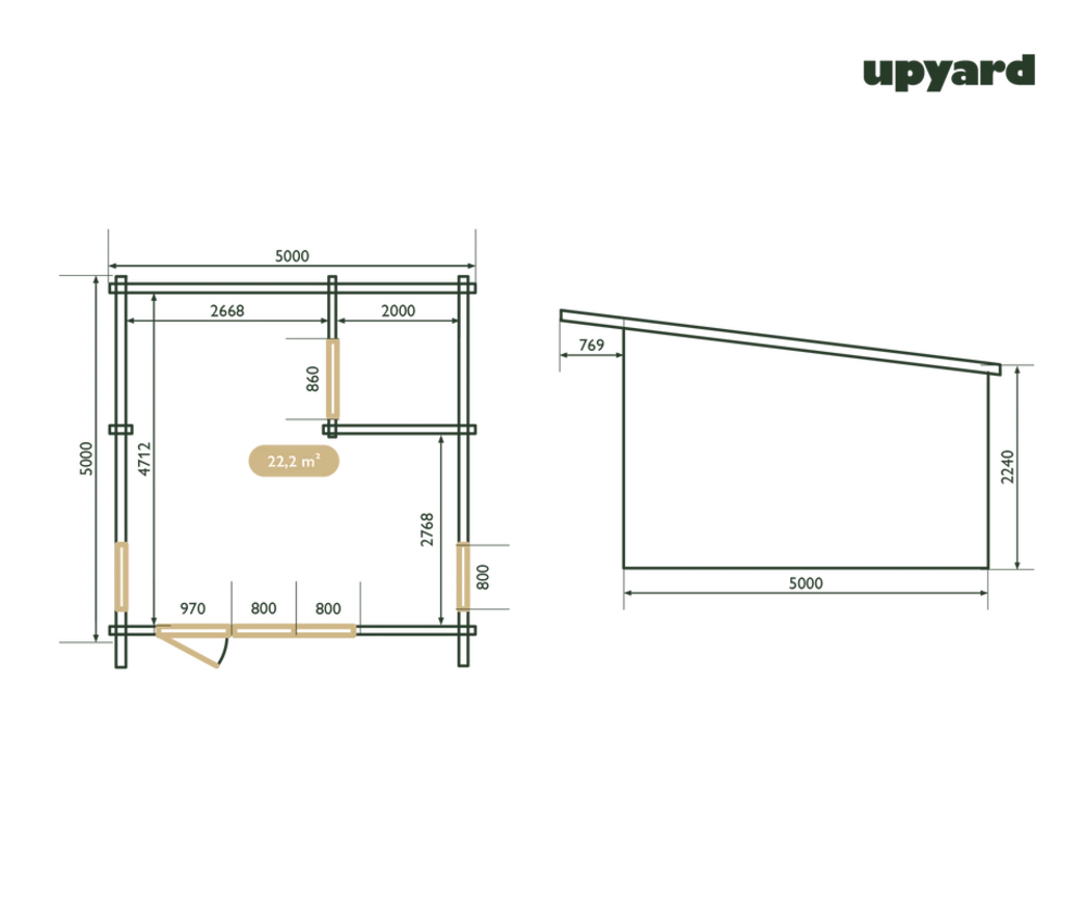la structure des murs est composée de poutres en bois faciles à assembler d’une épaisseur de 44 mm. La construction pliable assure une stabilité maximale contre les vents forts et les intempéries. De plus, la structure est renforcée avec des contrevents pour garantir la résistance aux conditions climatiques.