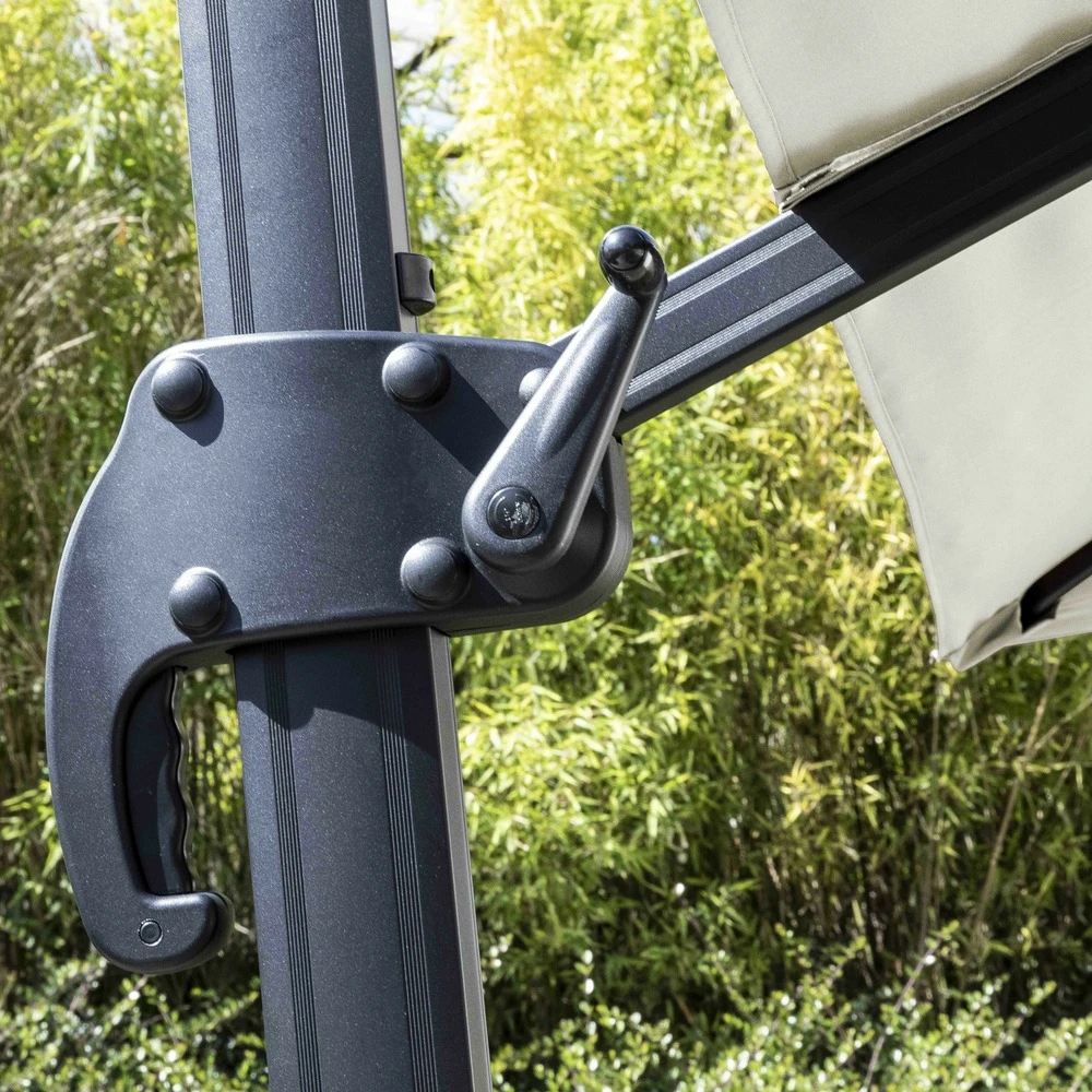 parasol déporté carré esthétique 3 x 3 m, et 2,5 m de hauteur, procure une large surface de 9 m² d’ombrage, idéal pour terrasse et jardin. Ce parasol excentré est très solide grâce à son mât principal de 77 mm x 53 mm de diamètre et son mât déporté 26 mm x 45 mm maintenu par 8 baleines. Ce parasol de jardin est très résistant grâce à sa structure 100 % en aluminium et sa toile 100 % polyester 250 g/m². Cette toile de parasol dispose d’un traitement anti uv, est déperlante et teintée dans la masse pour éviter toute décoloration… inclus 4 dalles lestées.