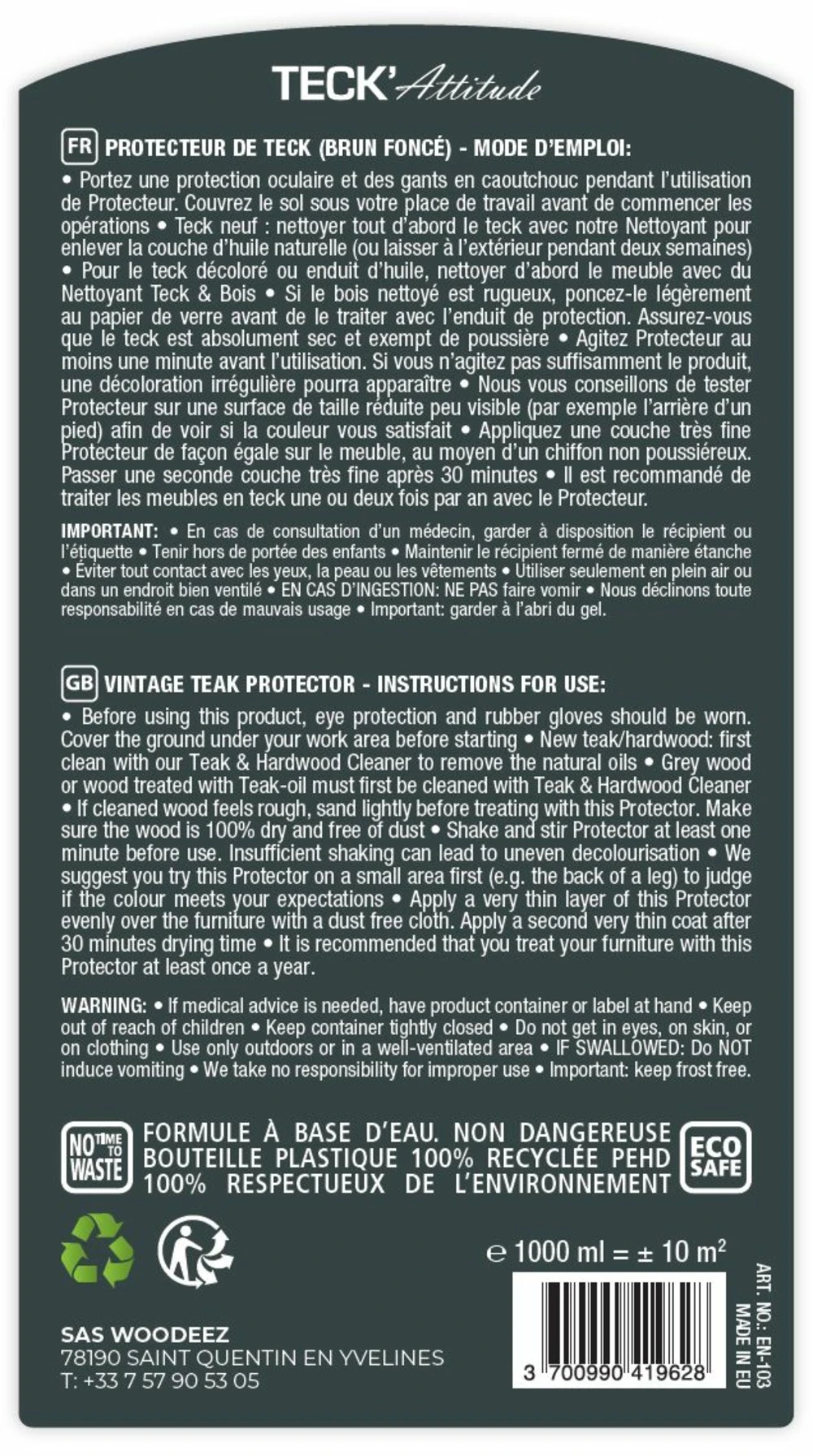 la formule non grasse à base d’eau permet d’éviter les taches noires souvent observées avec l’utilisation de l’huile pour teck.